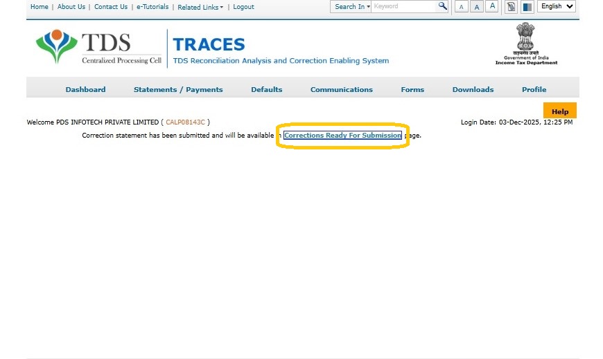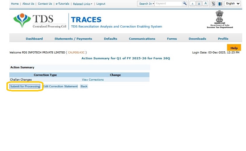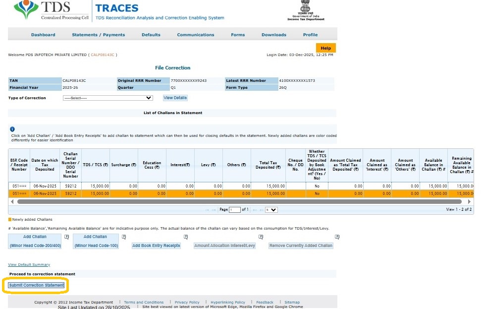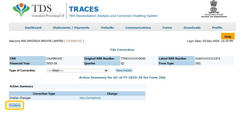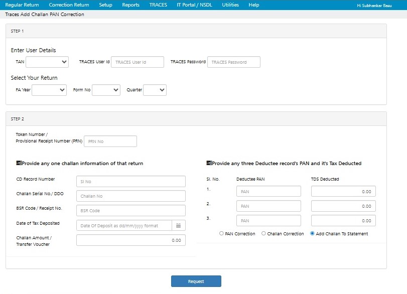 Challan Correction : Select ‘Challan Correction’ and click on ‘Request’ . This will take you to the TRACES interface where the Challan corrections can be done. Please follow the instructions and make the necessary Challan corrections.