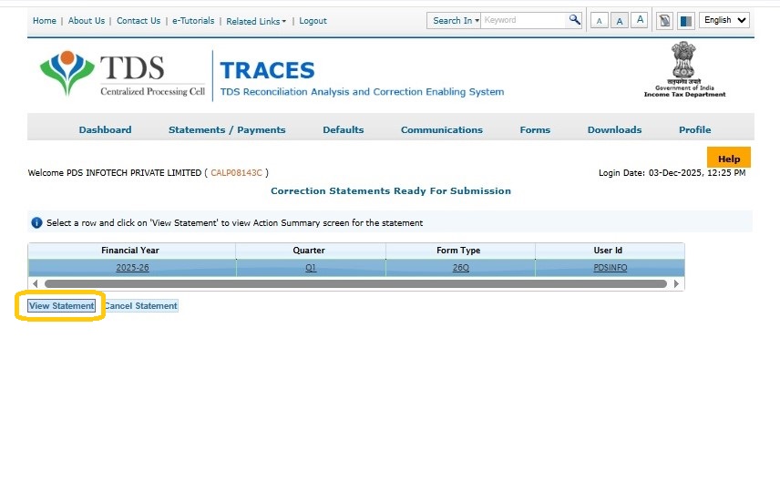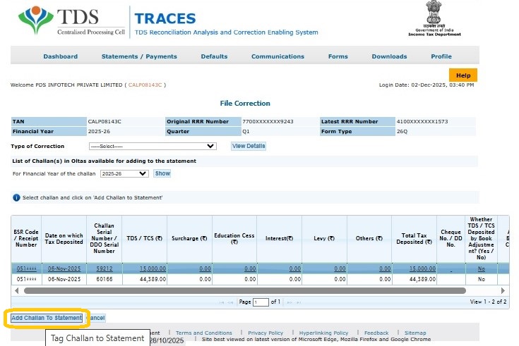 This will take you to the TRACES interface. Please follow the instructions and add the necessary Challan(s) to Statement.