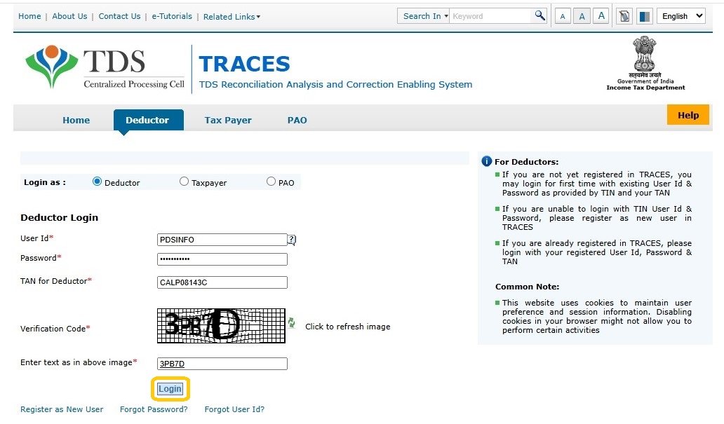Enter User Details : Enter the Login details of the user i.e. TAN, TRACES User Id and Password