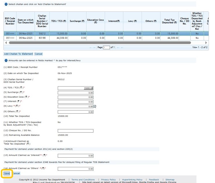 Once the challan is added it has to be attached to the Statement. In order to do this click on ‘Add Challan To Statement’.
