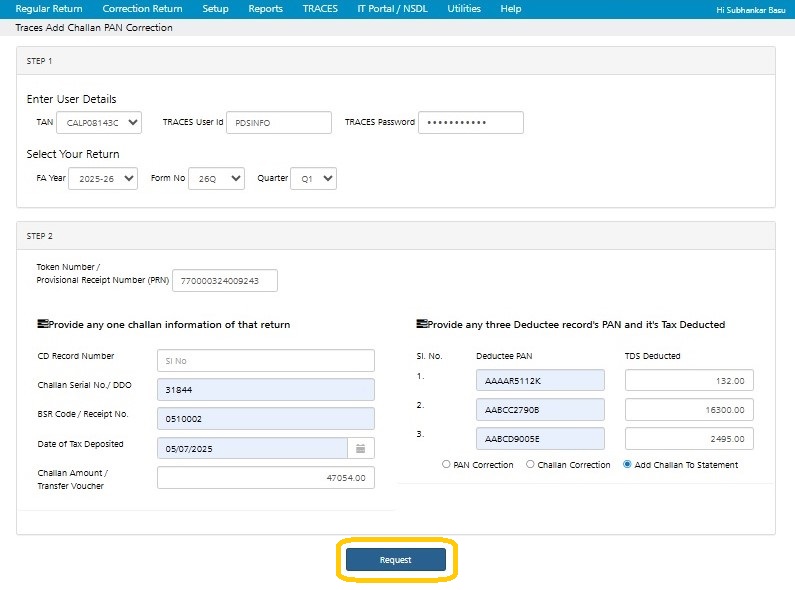 Click on ‘TRACES > Add Challan / PAN Correction’