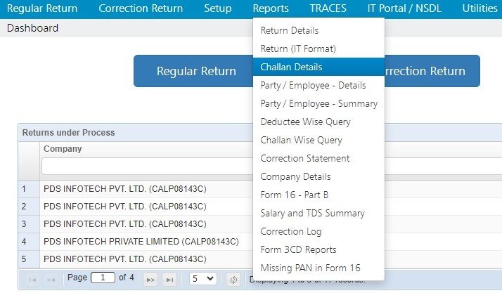 In order to view this report, click on Challan Details option, under Reports :