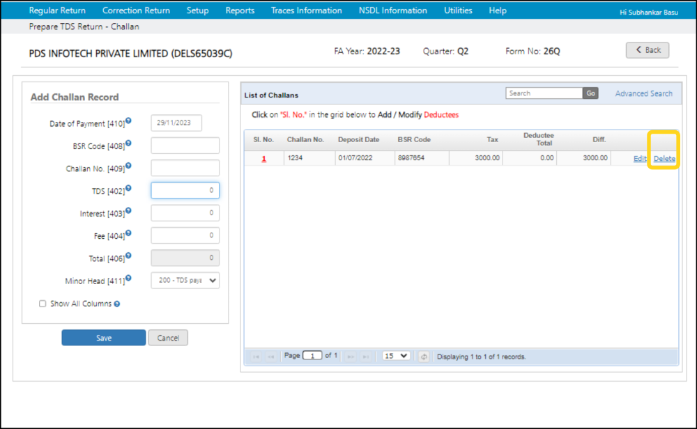 Note: Whenever a challan is deleted, then all the deductees present in that challan will also subsequently get deleted.