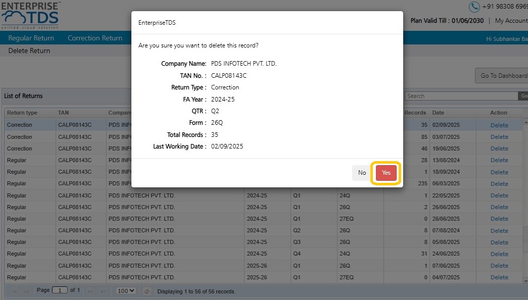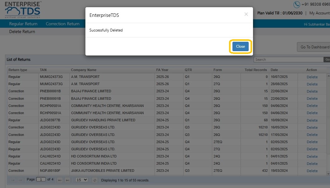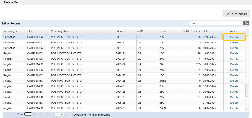 EnterpriseTDS gives the facility to delete the Return from the system. In order to so, click on ‘Utilities > Delete Return’ :