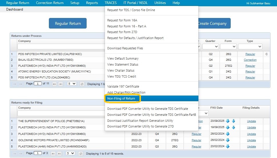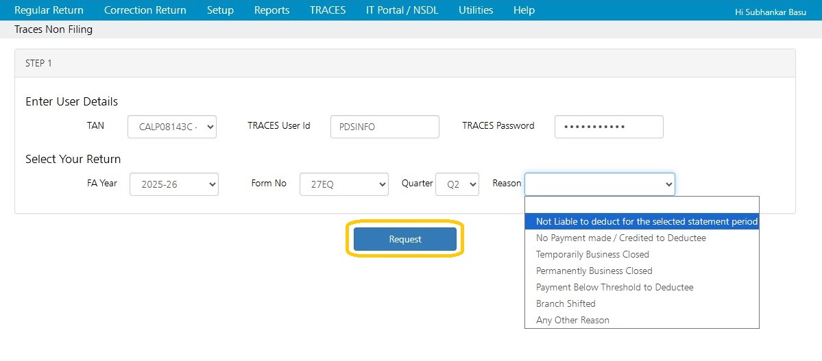 Click on ‘TRACES’ > ‘Non-Filing of Return’