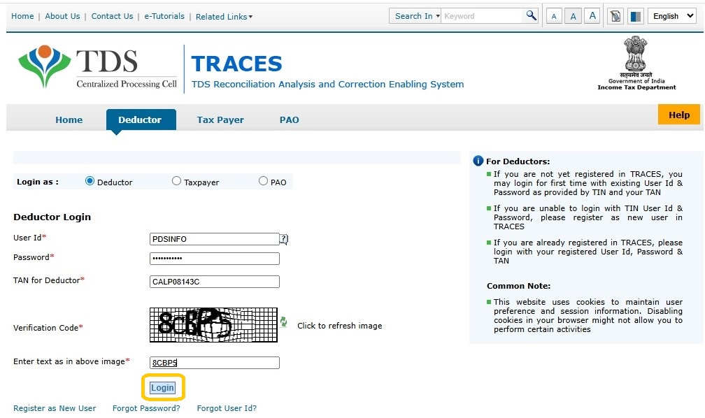 Click on ‘Request’. In the next step, login to TRACES, the following is displayed: